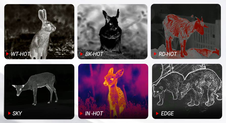 Pozorování Vám zpříjemní i 6 zobrazovacích módů (White Hot, Black Hot, Red Hot, EDGE, IN HOT, SKY) a máte také na výběr ze 3 pozorovacích scén (City, Rain, Forest).